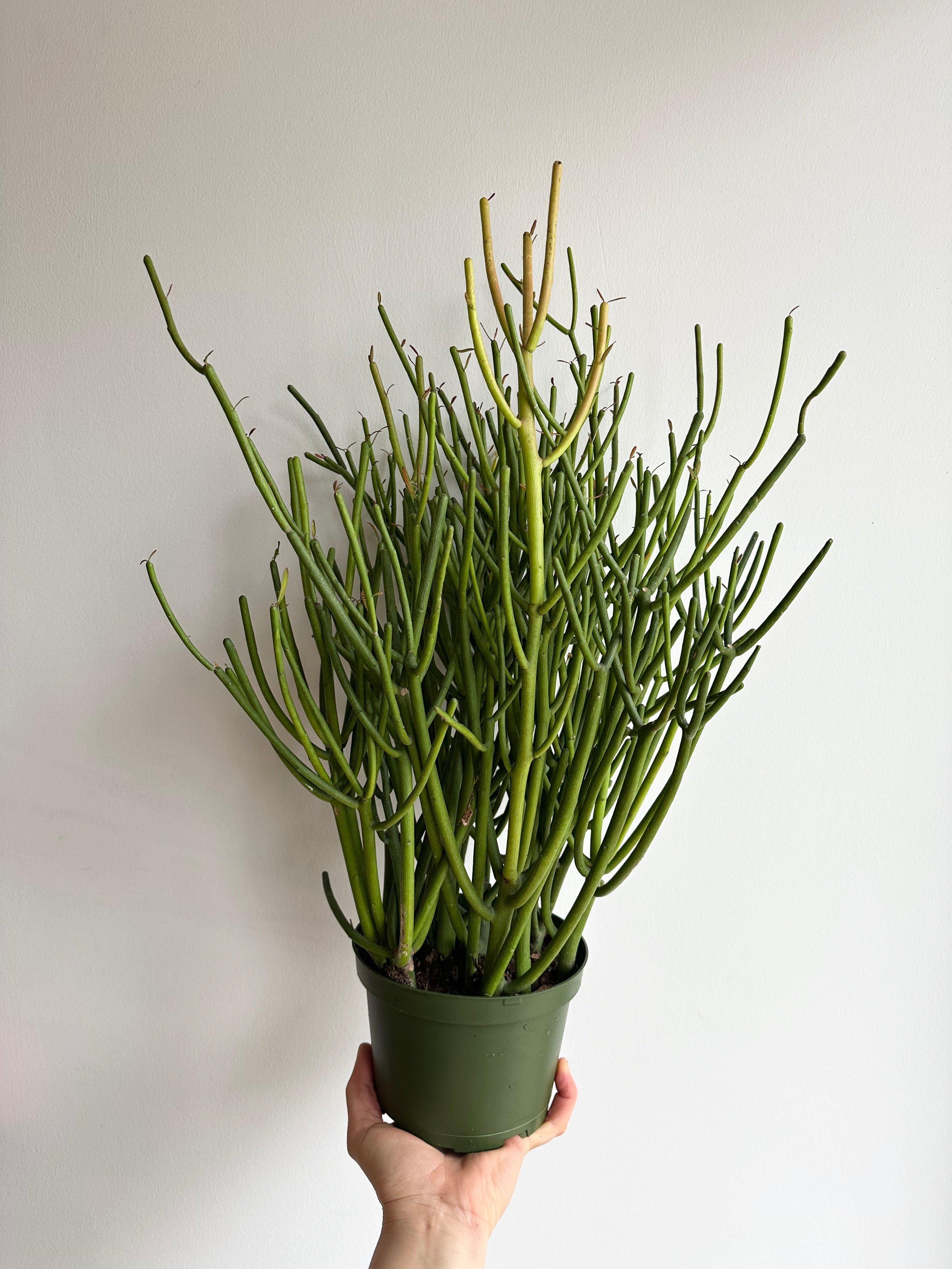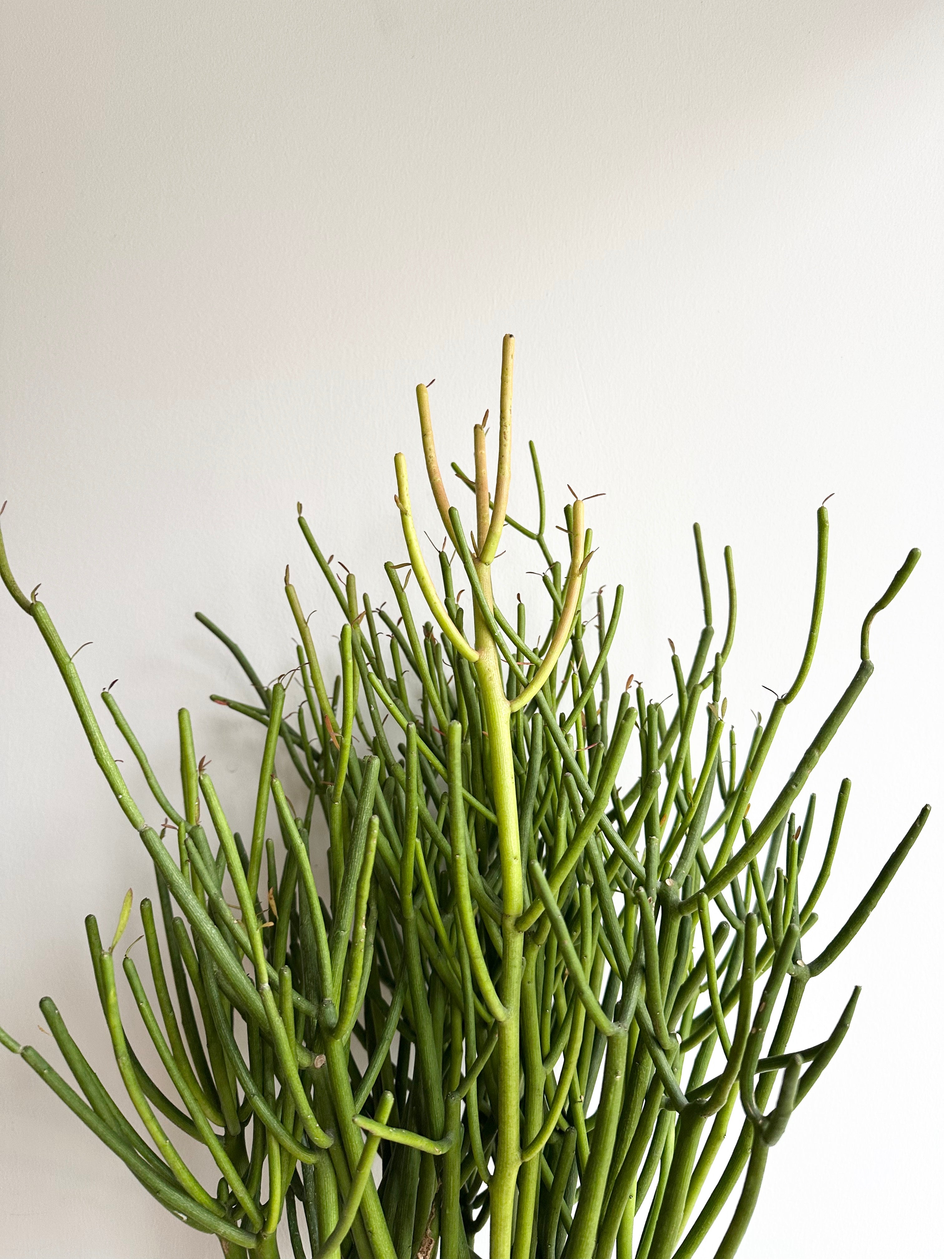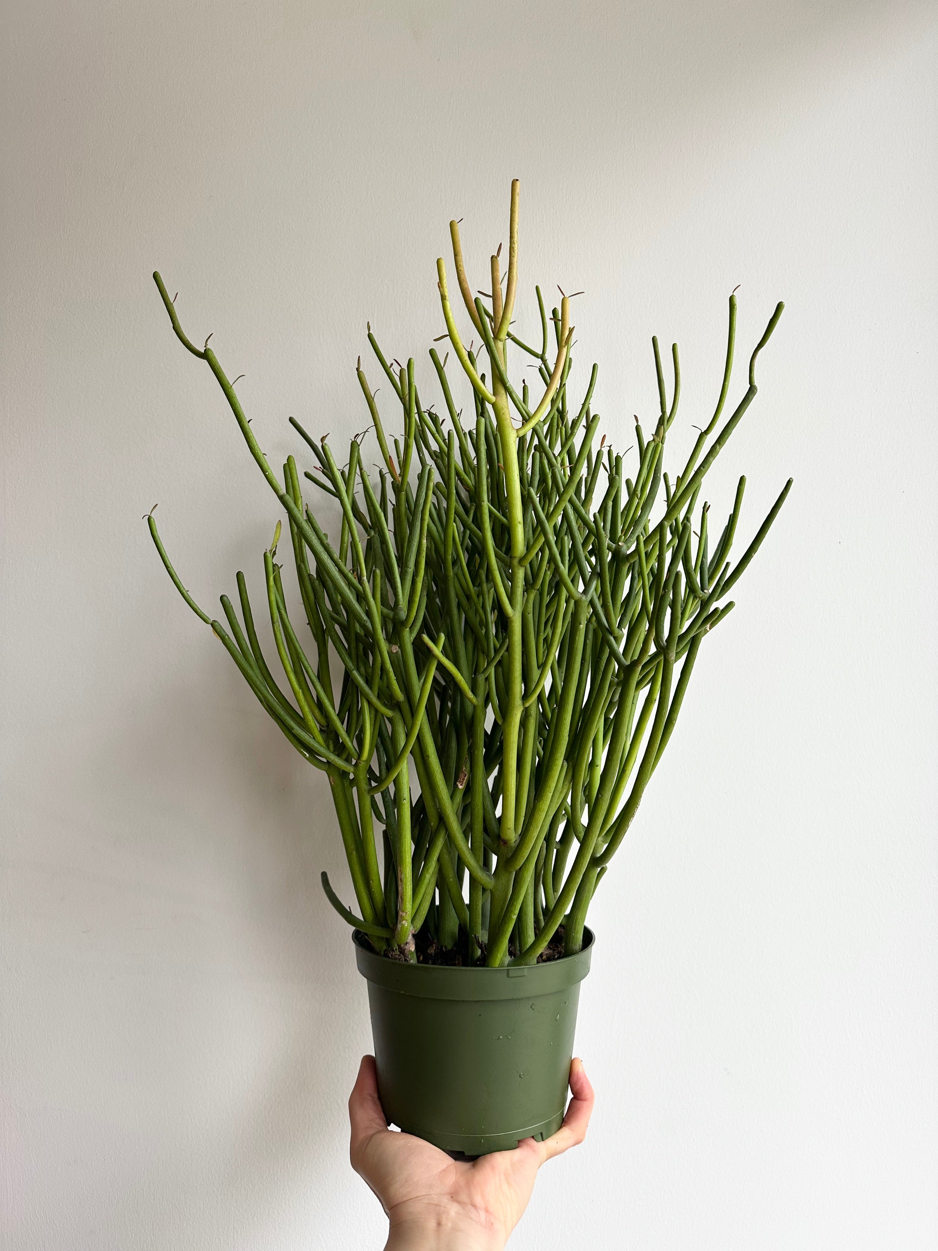 The Pencil Cactus “Fire Sticks” (Euphorbia tirucalli) is a very unique plant that is more succulent like then cacti. Its long green skinny leaf structures are stick like and give the plant its common name due to it’s resemblance to pencils. The “Fire Sticks” variety produces gorgeous yellow/orange/red tones on the tips of its structures. This colour change is heightened in brighter light situations. Pencil Cactus plants can grow to 9 ft plus if given the right requirements.