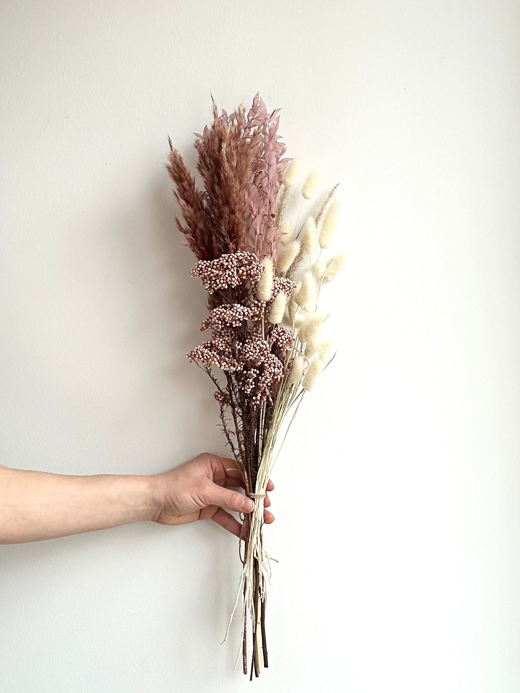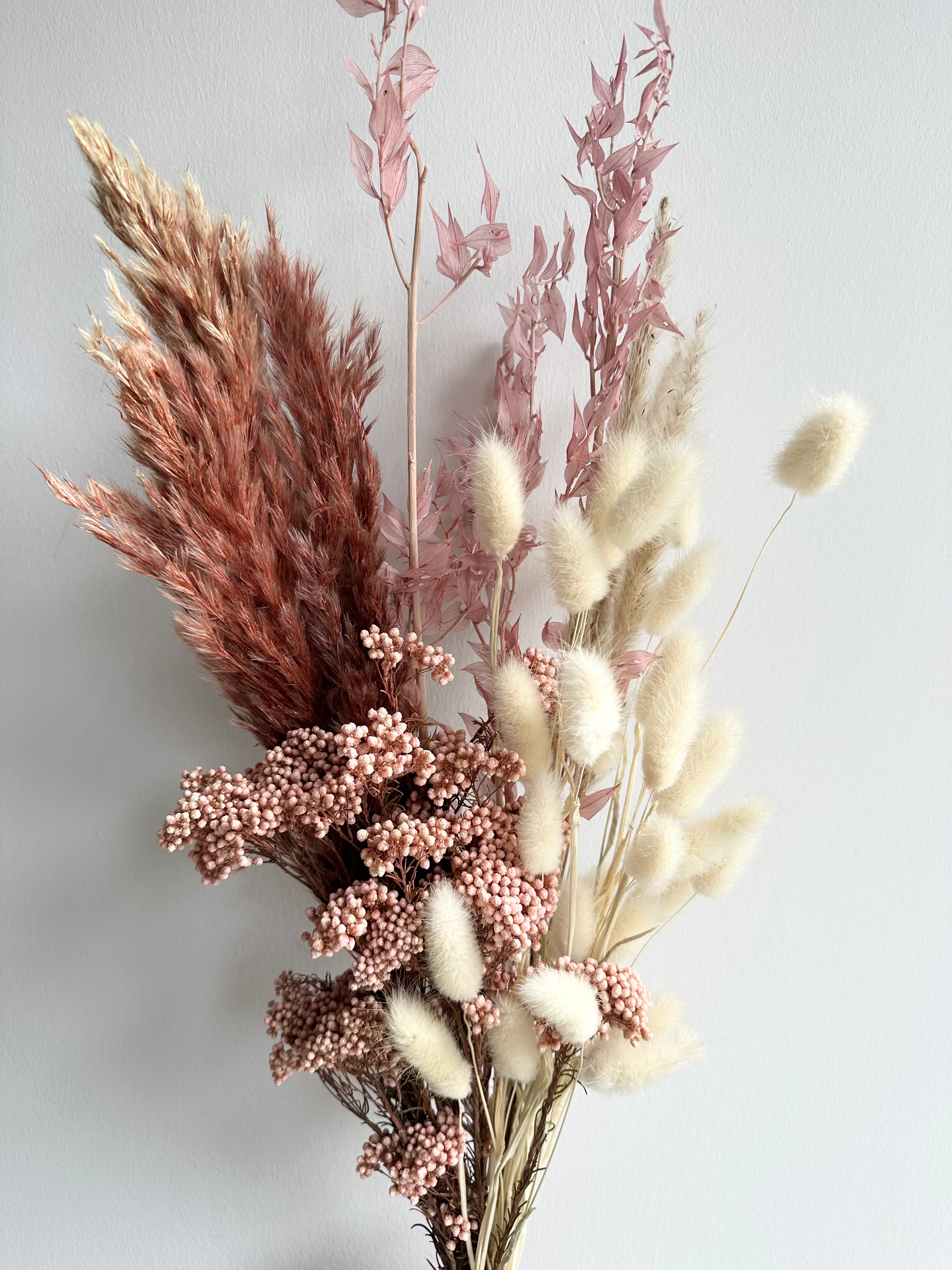 This floral arrangement consists of dry (preserved) stems, florals and grasses. These everlasting bouquets can be enjoyed for years with minimal maintenance.