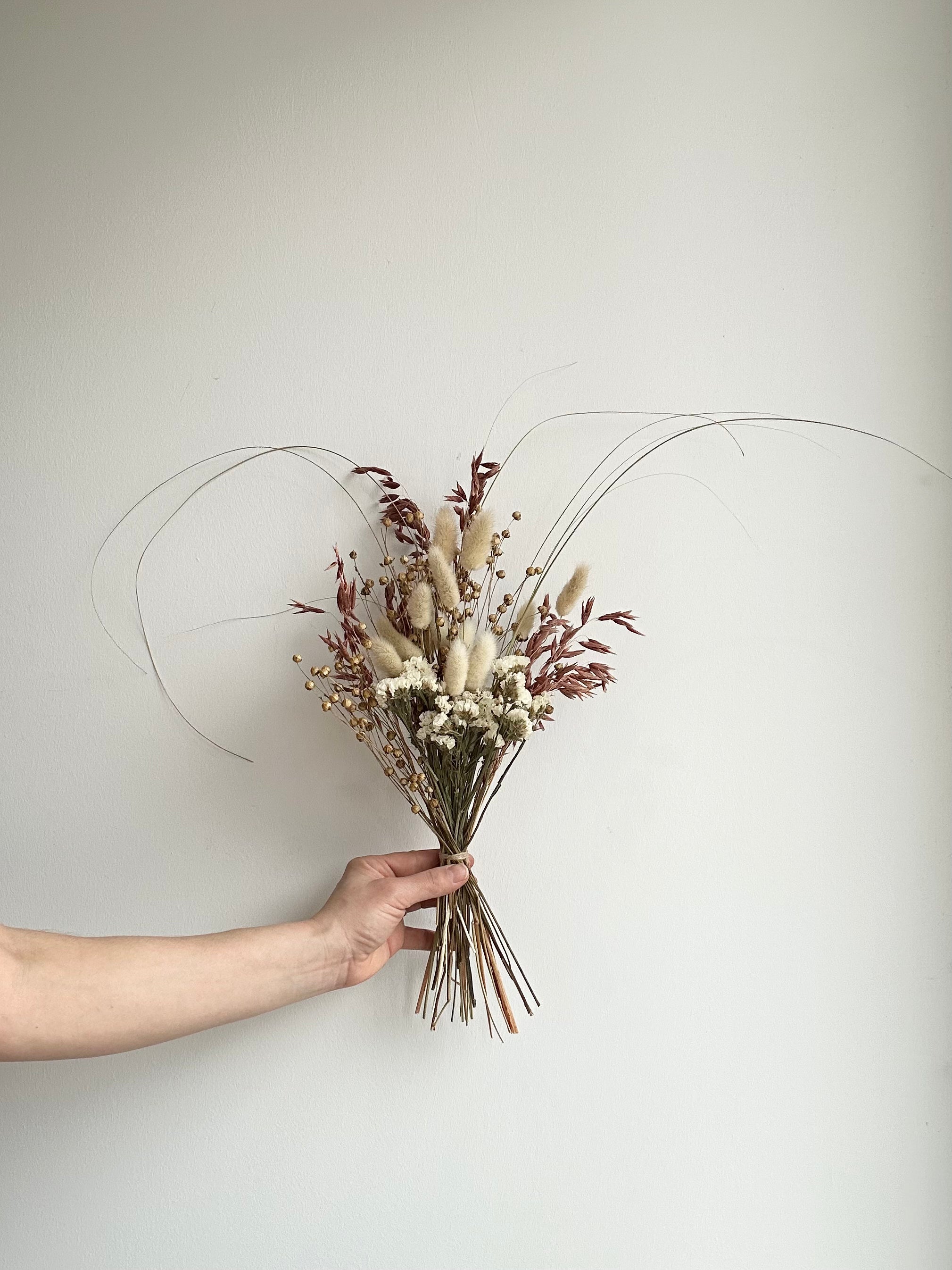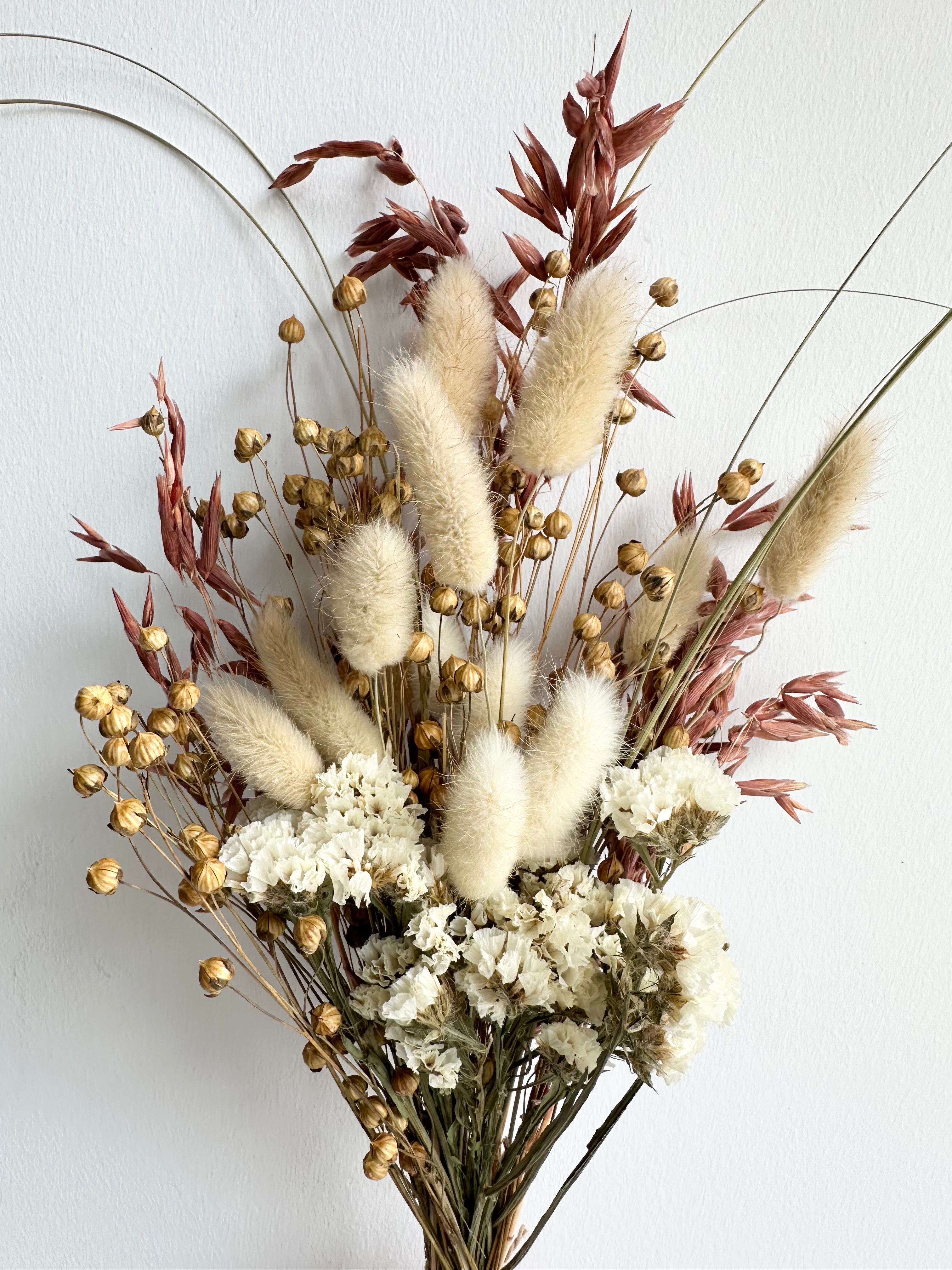 This floral arrangement consists of dry (preserved) stems, florals and grasses. These everlasting bouquets can be enjoyed for years with minimal maintenance.