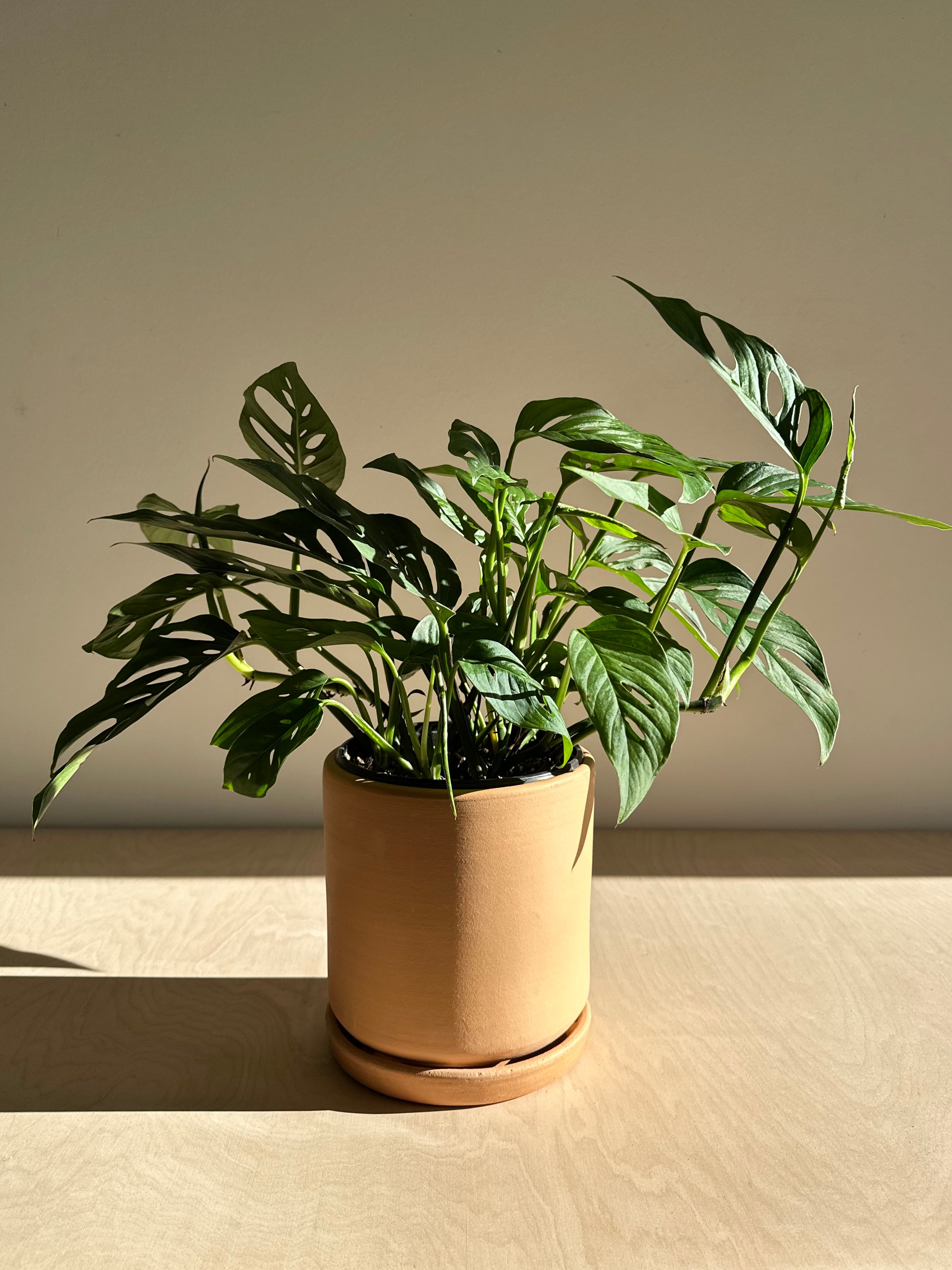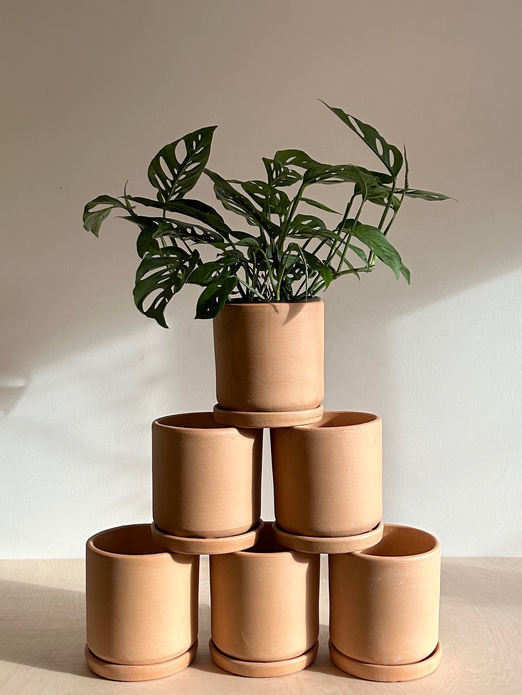 Cylinder in shape, these handcrafted clay pots contain a drainage hole and include a saucer. Repot worry free, knowing your plants are in a breathable material that has drainage!
