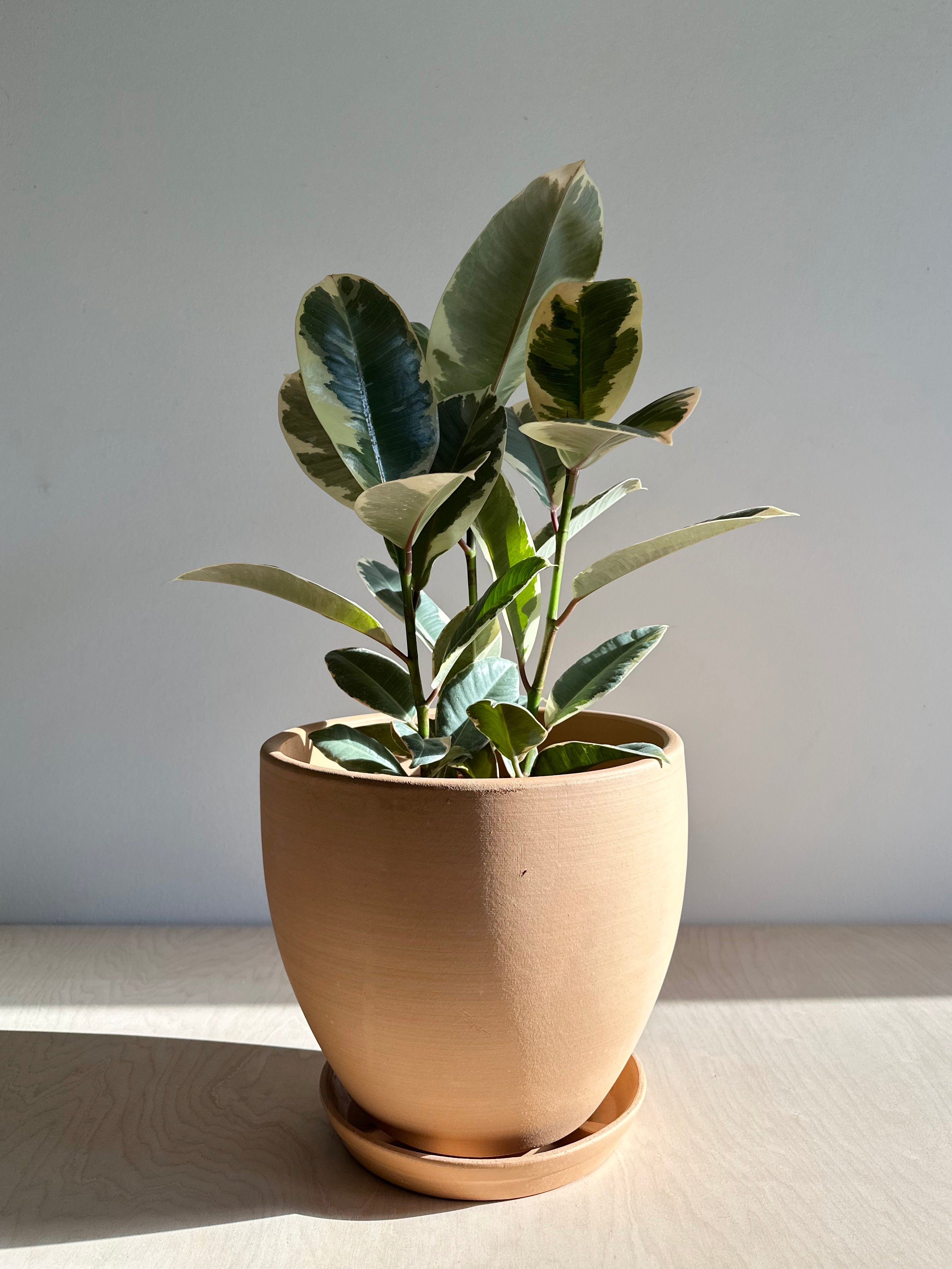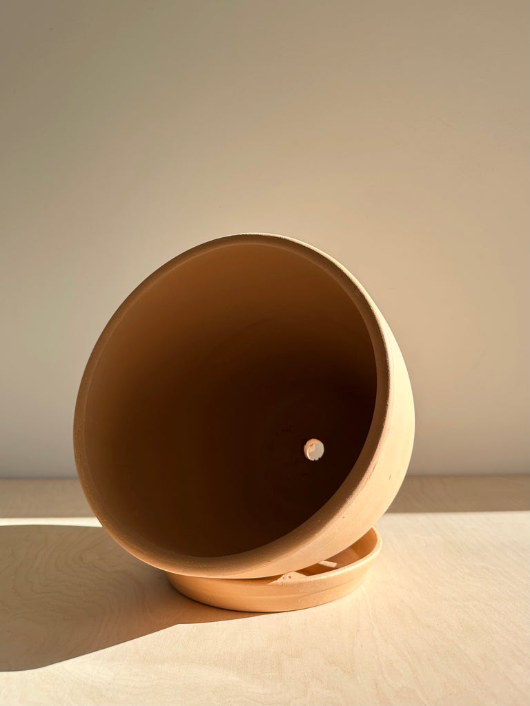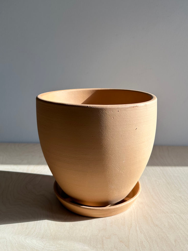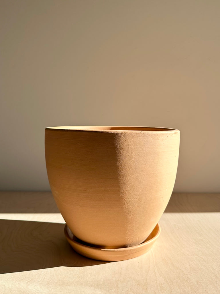 This classic bell shaped terracotta pot has a drainage hole and comes with a saucer.