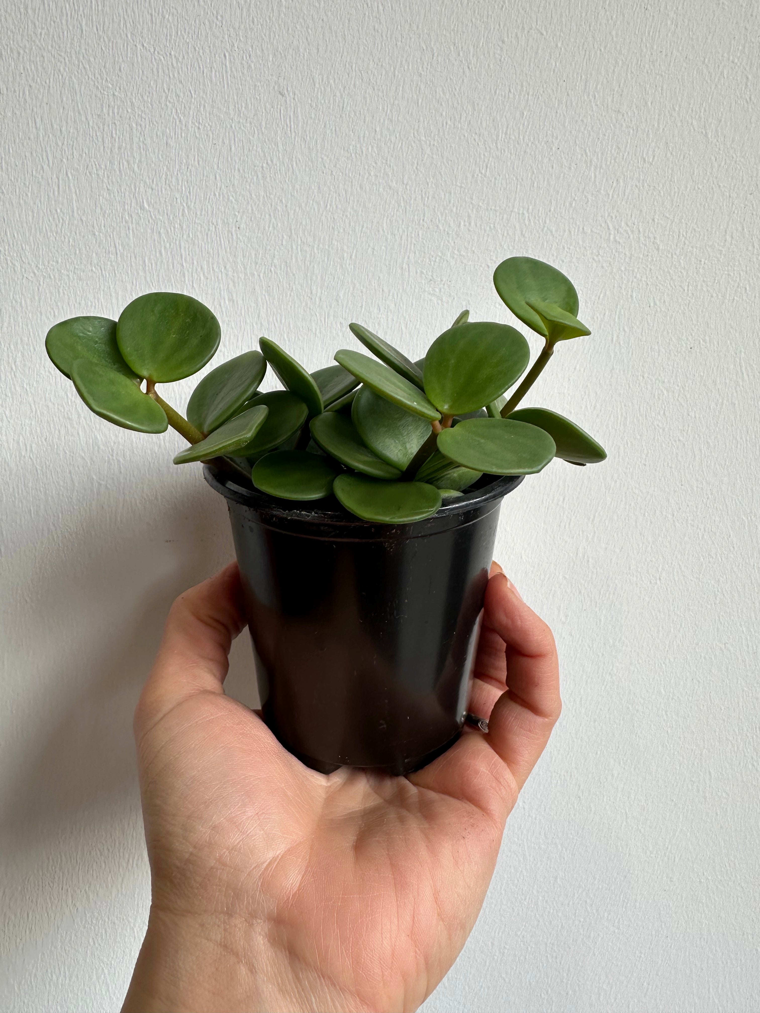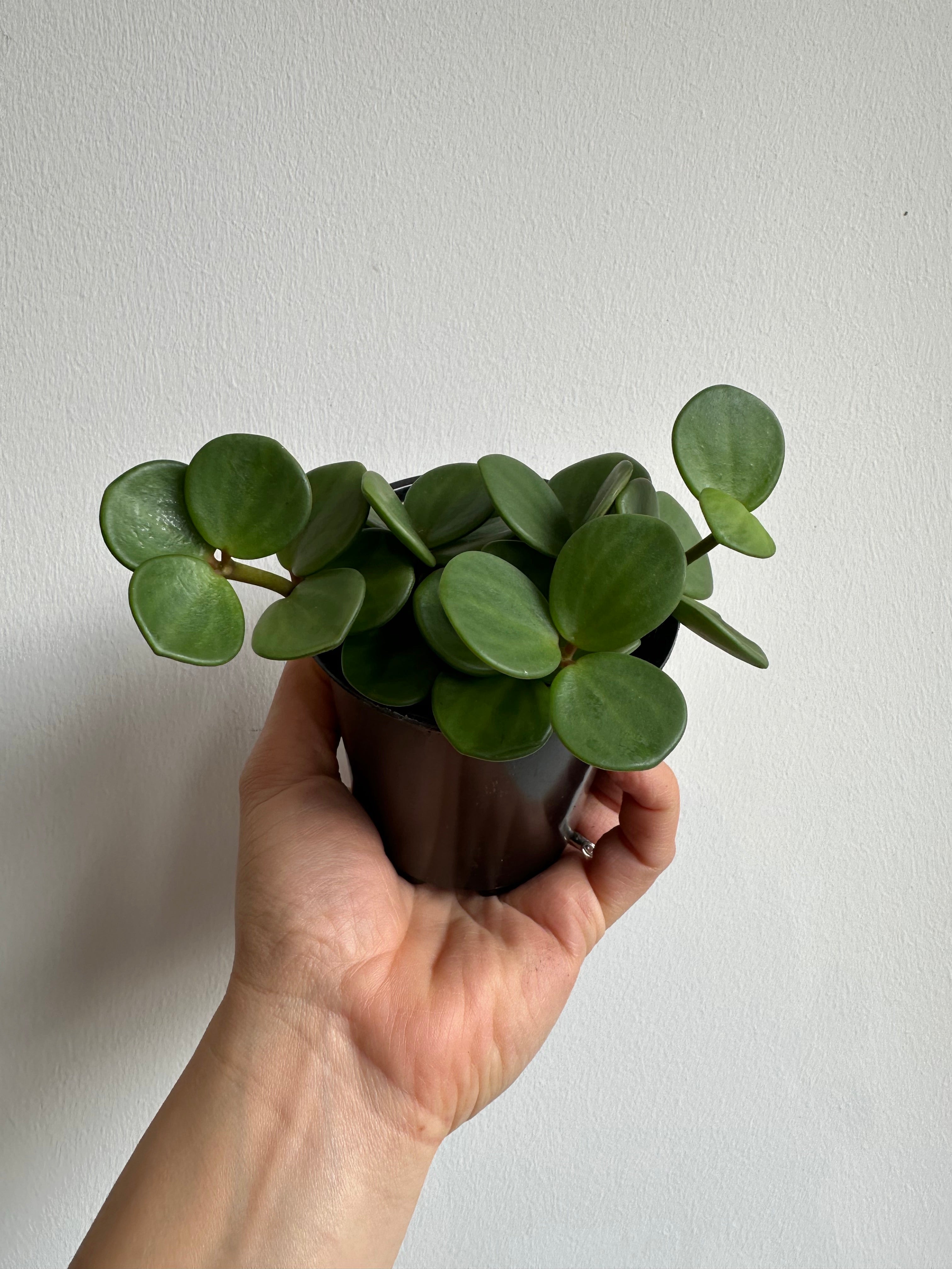 Peperomia “Hope” is a trailing plant with small round leaves. It’s cascading stems are adorned with thick rubbery leaves that are green in tone.