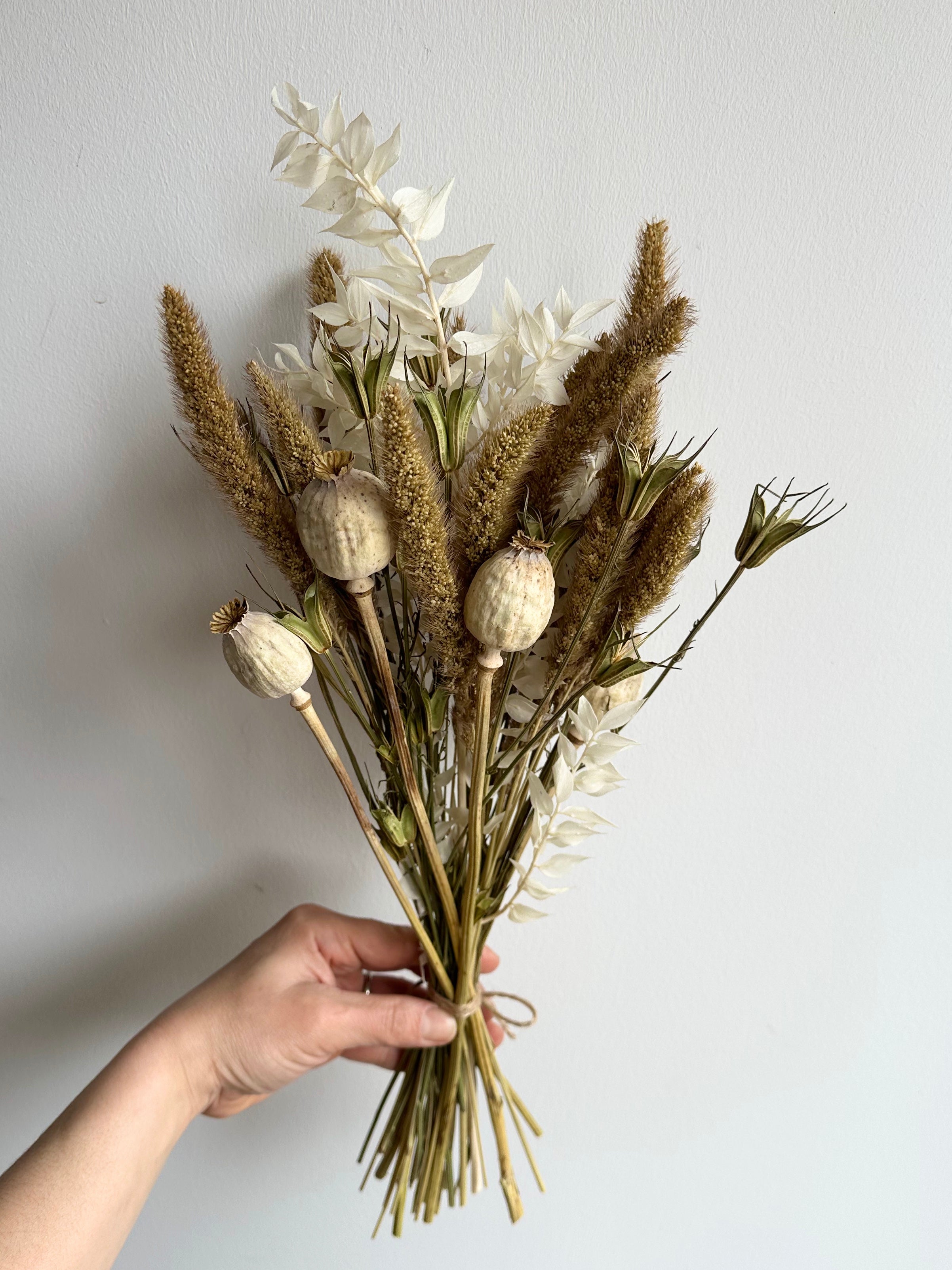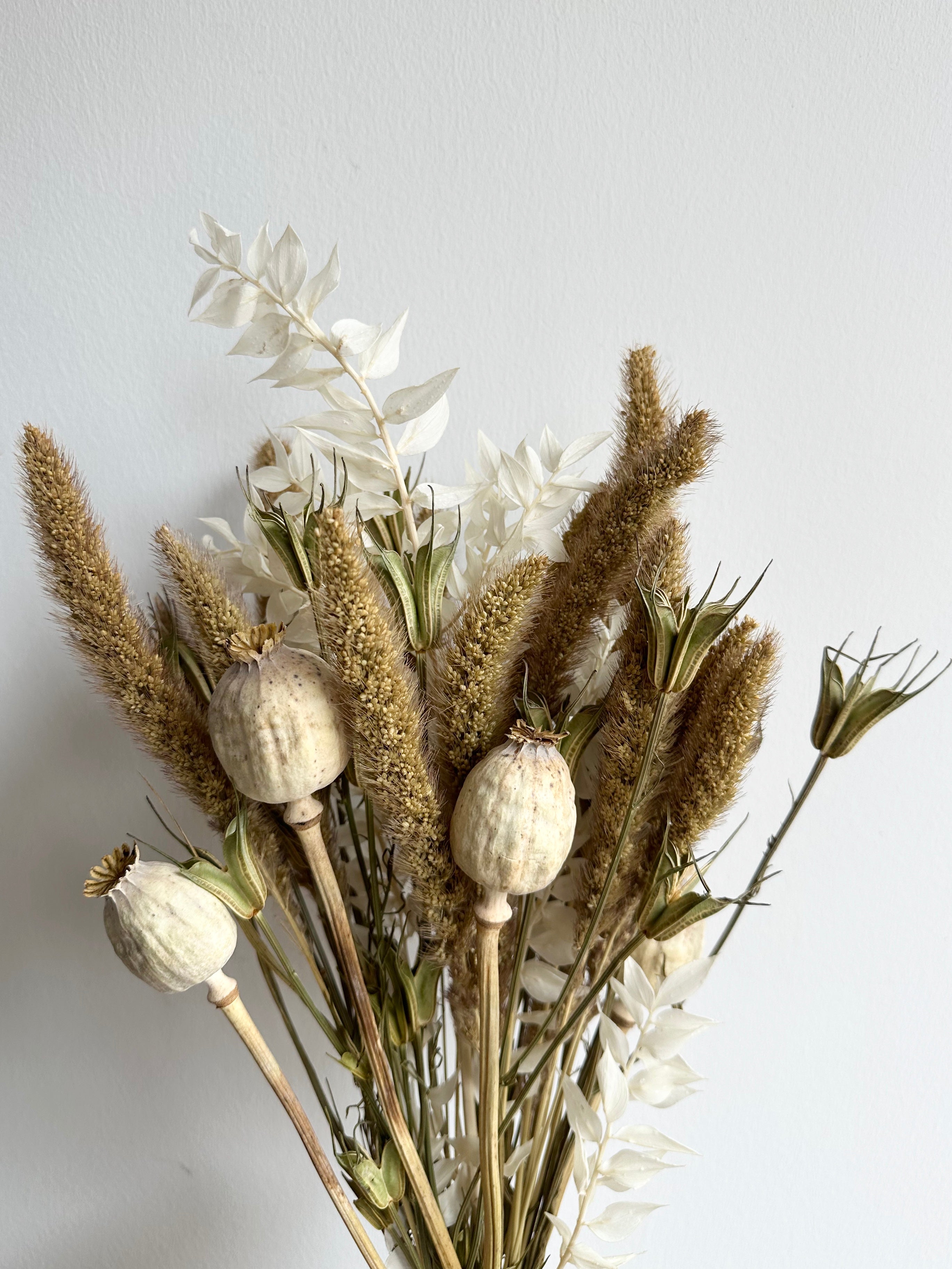This floral arrangement consists of dry (preserved) stems, florals and grasses. These everlasting bouquets can be enjoyed for years with minimal maintenance.